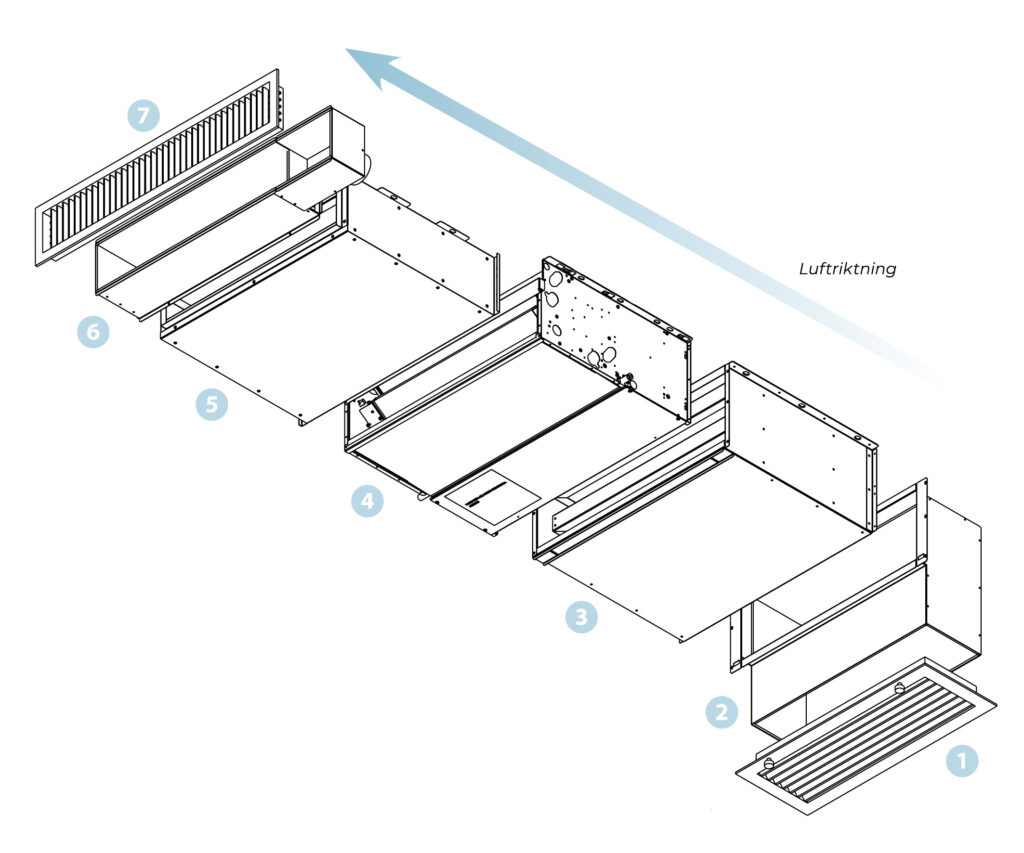 Utblåsningskanalen är rak och leder luften rakt in i hotellrummet. Den har en 80 mm stos för tilluft från ventilationssystemet, inget separat don behövs. Luften kommer in via tilluftsgallret och blandas med den behandlade luften. Som standard finns tilluftsanslutningen på motsatt sida mot vattenanslutningen, men den går att placera på samma sida som vattenanslutningen.