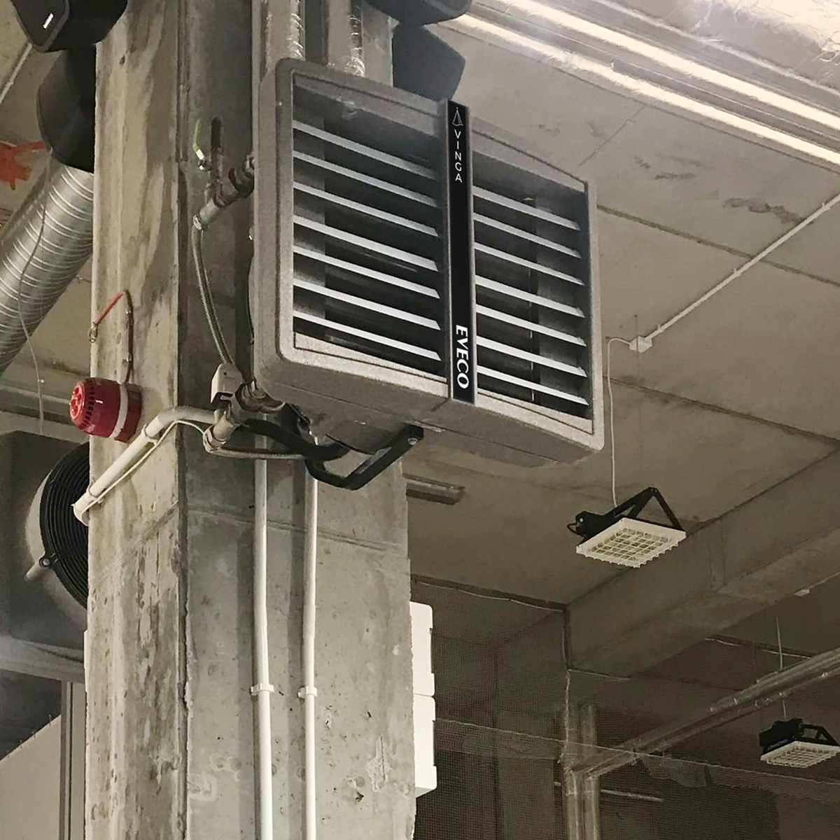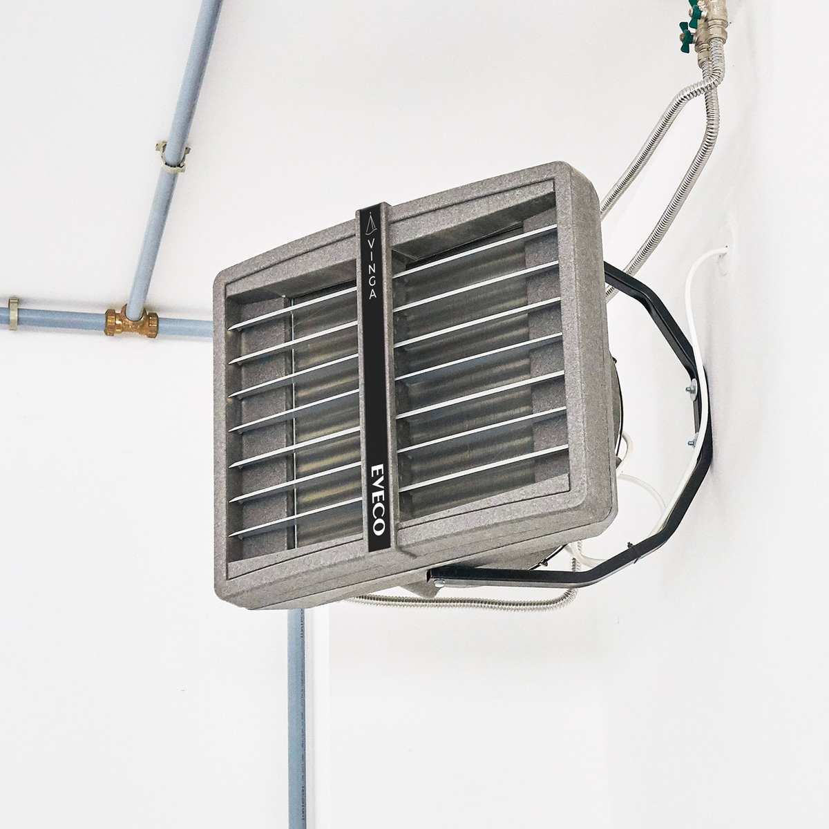 Vinga fläktluftvärmare monterar du antingen på väggen eller i taket. Placera fläktluftvärmaren där den ger en optimal luftfördelning i lokalen. Se till i förväg att det finns utrymme för el- och vatteninstallationer.
