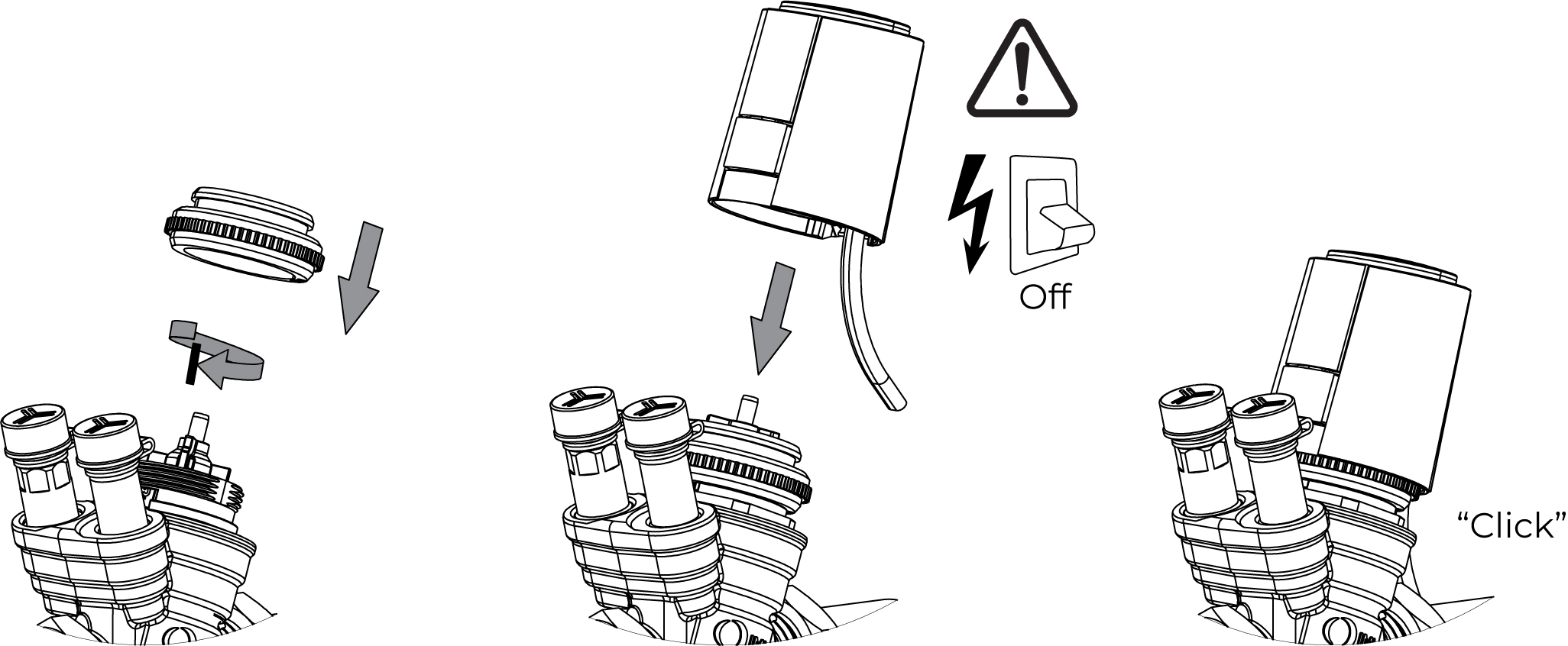 För att underlätta monteringen av ställdonet på ventilen skruvas först medföljande ”snap-on”-ring på ventilen. Därefter kan ställdonet enkelt klickas på plats. Observera att detta skall göras i strömlöst tillstånd. Ställdonet har även en First-open-funktion. Det innebär att ställdonet till att börja med håller ventilen öppen utan ström. Detta förenklar installationen, och möjliggör värme under byggtiden, redan innan el/styr är klara. Vid idrifttagning aktiveras sedan ställdonet enkelt genom att matningsspänningen sätts på i minst minst 6 minuter.